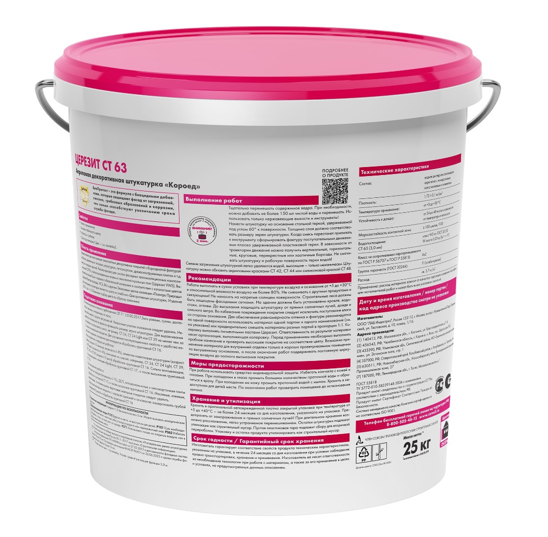 Описание товара: "Штукатурка акриловая Ceresit СТ 63 3,0 мм "короед" база (25 кг)"