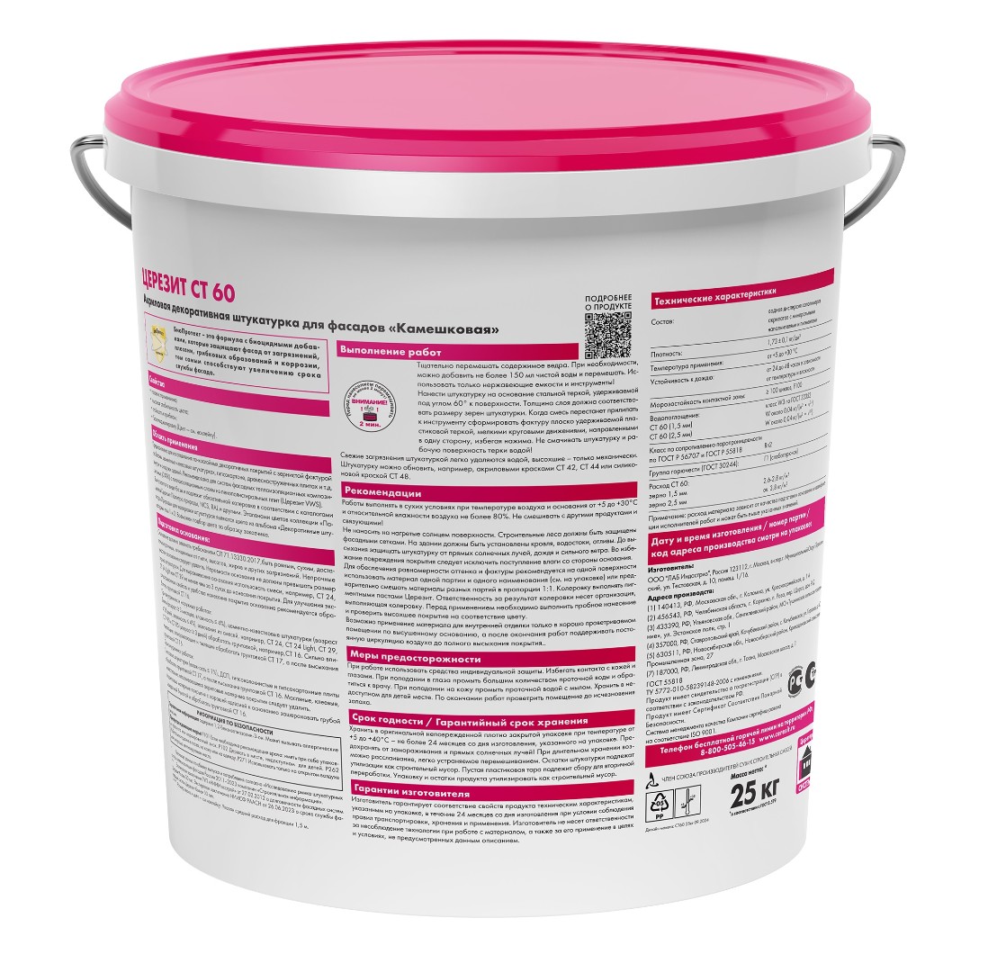 Штукатурка СТ 60/25 кг акриловая-это готовая к применению декоративная структурная штукатурка с фракцией наполнителя 1,5 мм.
